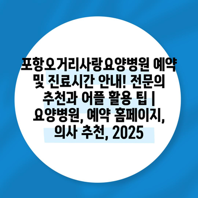 포항오거리사랑요양병원 예약 및 진료시간 공지! 전연락 추천과 어플 활용 팁 | 요양병원, 예약 홈페이지, 의사 추천, 2025 에 대해 자주 묻는 질문 TOP 5